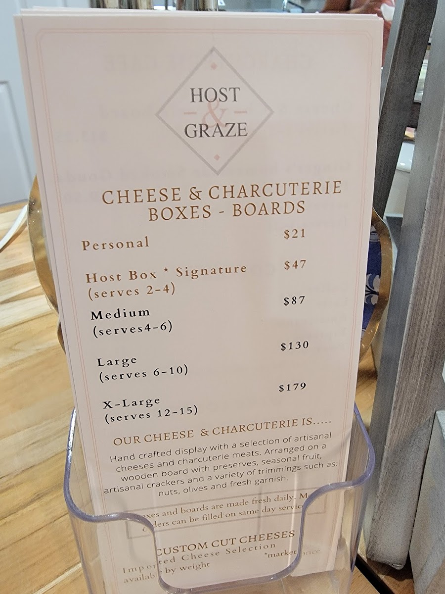 Welcome to Host & Graze, a charming café nestled in Sunset Beach, NC, where culinary artistry meets personal service. Their menu is a delightful exploration of charcuterie and fine wines, perfect for various occasions. The highlight of their offerings includes beautifully crafted cheese and charcuterie boards, catering to gatherings of all sizes. The Small Board, ideal for 24 guests, artfully displays 3 artisanal cheeses and 2 charcuterie meats, alongside fresh fruits and gourmet crackers for just $69.00. For a more personal touch, try their Personal Cheese & Charcuterie Box, featuring an exquisite selection of flavors for $21.00.
